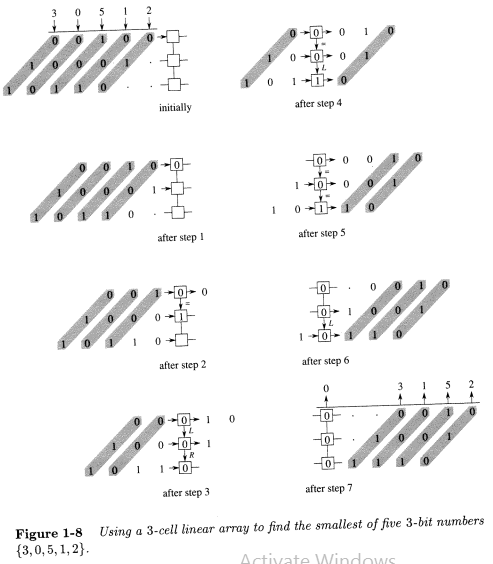 روش سوم: برای بهتر شدن مرتبه الگوریتم به جای مقایسه باینری میتوانیم به صورت خطی مقایسه کنیم! این روش روش پایپلاین است و مانند روش درختی نیست که فقط روش مقایسه در هر ستون از پردازنده ها را عوض می کرد و می توانست در روش مرتب سازی با آرایه خطی مورد استفاده قرار گیرد. این روش بدون استفاده از پردازنده های بیشتر ( مانند روش درختی ) مرتبه الگوریتم مرتب سازی را بهتر می کند. در مثالی که در شکل زیر آورده شده است از آرایه 3-سلولی برای مرتب سازی 5 عدد داده شده استفاده می کند. همانطور که در شکل مشخص است اعداد به صورت باینری ( 3 بیتی) و شیفت داده شده ( به صورتیکه اگر بیت iام عدد k در زمان t وارد آرایه شود بیت i+1ام در زمان t+1 وارد خواهد شد.) شیفت ورودی ها باعث می شود که در زمان مقایسه دو بیت در یک پردازنده در آرایه بیت پر ارزش تر همین اعداد در کلاک قبلی مقایسه و نتیجه اش آماده باشد. تعداد دقیق گام ها برای فاز اول ( مرتب سازی) در این الگوریتم برابر :