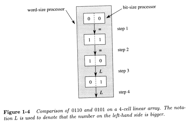 هر پردازنده یک عدد 4 بیتی را می تواند ذخیره کند و یک عدد 4 بیتی دریافت می کند و بیت به بیت از پر ارزش ترین بیت این دو عدد را مقایسه می کند. هر گاه اولین بار به بیت هایی برسد که مساوی نباشند تصمیم برای جایگزینی یا عبور عدد دریافت شده گرفته می شود و این سیگنال به بیت های کم ارزش تر هم منتقل میشود. در این مثال چون عدد 4 بیتی است 4 کلاک برای این مقایسه زمان صرف می شود.